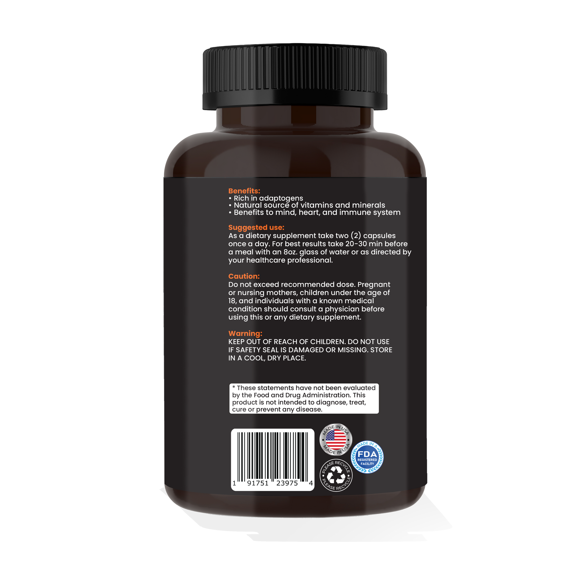 Caution: Do not exceed recommended dose. Pregnant or nursing mothers, children under the age of 18, and individuals with a known medical condition should consult a physician before using this or any dietary supplement.